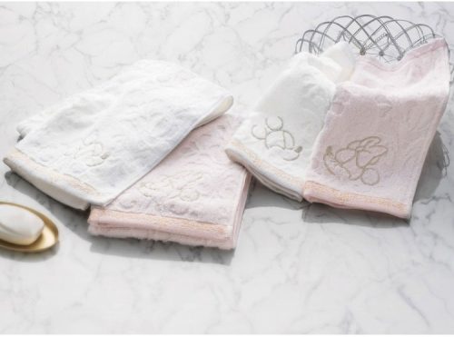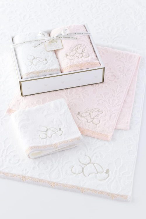 愛らしいミッキーとミニーのアートをエレガントな刺繍で表現したタオルギフトです。裾に配されたラメ糸を使用したティアラのような華やかなボーダーがおしゃれ。上質な素材感とディズニーキャラクターの魅力を絶妙に融合させた大人かわいいデザインが魅力です。