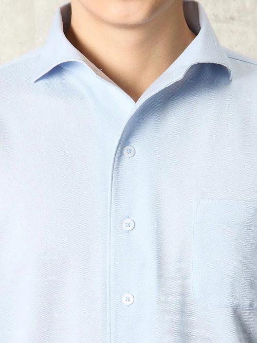 格子状の立体的な織柄が肌へのペタつきを予防。ホリゾンタルカラーで、ノーネクタイでも凛とした襟の立体感を保ちます。タイドアップからクールビズスタイルまで幅広く着回したい方にぴったりです。