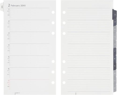 週間レフトタイプは、見開き左ページに1週間の予定表、右ページにメモスペースを配置した形式のリフィルです。左ページでは曜日ごとにスケジュールを管理でき、右ページには関連するメモやToDoリストを自由に書き込めます。日々の予定と付随する情報を管理しやすいのがポイントです。