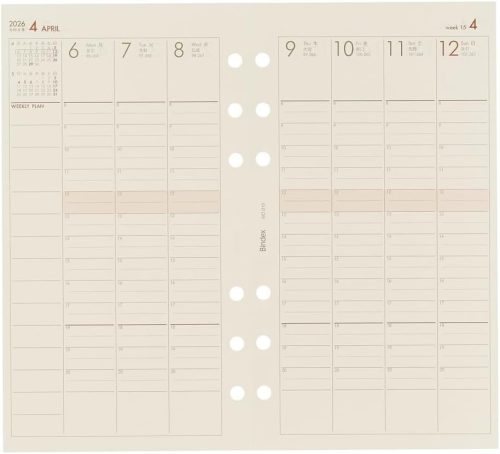 時間管理を効率的にサポートする週間バーチカルタイプのシステム手帳リフィル。バイブルサイズの6穴タイプです。FSC認証のオリジナルクリーム用紙を採用。サイズは、171×95mmです。