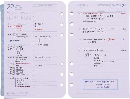 日々の予定や活動を詳細に記録したい方におすすめ。会議内容・アイデア・気づき・感想など、その日にあったことを細かく残せます。しかし、1日1ページ以上使うためほかのタイプに比べてリフィル枚数が多く、かさばりやすい点は考慮が必要です。