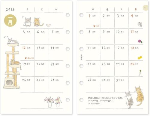 2025年12月から2027年1月まで使える月間ブロック形式で、19ページの方眼メモ付き。日曜欄には季節を感じる小さなイラストも添えられており、1年を通してネコたちの賑やかな様子を堪能できます。ネコが好きな方にもおすすめのアイテムです。