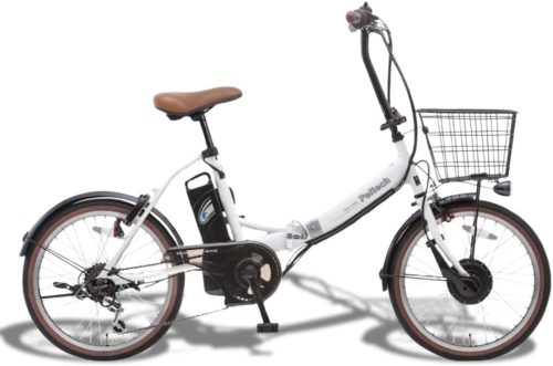 折りたためる電動アシスト自転車。3か所のレバーで簡単に折りたためるのが特徴です。前輪をモーターでアシストする独自の方式を採用しています。外装6段変速で坂道から平坦な道まで、走行シーンに合わせてギア調整が可能です。