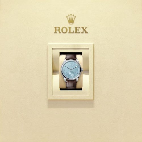 アイスブルーのダイヤルに施されたギョーシェ装飾が特徴の時計です。6時位置のスモールセコンドを中心に、ロゼット状の立体的な幾何学模様がダイヤル全体に広がった美しい見た目が魅力。光の当たり方によって表情が変わる、洗練された仕上がりです。
