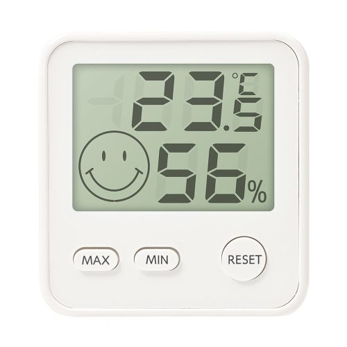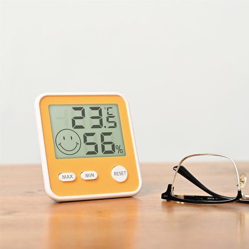 部屋の快適度を顔のアイコンで知らせるデジタル温湿度計。大型液晶画面を採用しており、表示された数値が見やすいのが特徴です。豊富なカラーバリエーションのなかから、部屋の雰囲気に合わせて選べます。