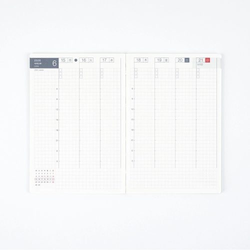 自由度の高い4月始まりのウィークリー手帳です。セミバーチカルタイプで時間軸がないため、予定を整理したり、ToDoを書き出したりとさまざまな使い方ができます。ウィークリーページの下部は方眼になっており、メモなどを書き込めるのも特徴です。