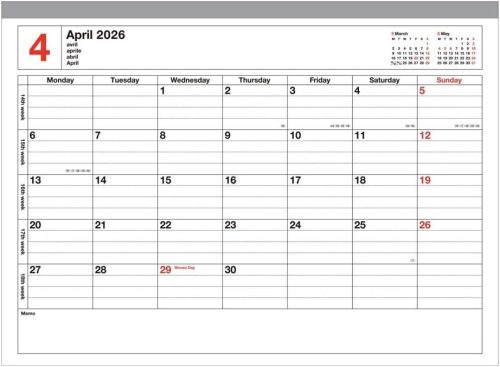 カレンダーとしても使える4月始まりの手帳です。ページが縦に開く仕様で、机の上に配置して、月間予定をひと目で確認できるのが特徴。たっぷり書き込めるメモページも用意されているので、仕事からプライベートのスケジュール管理まで、幅広い用途で活躍します。