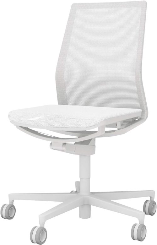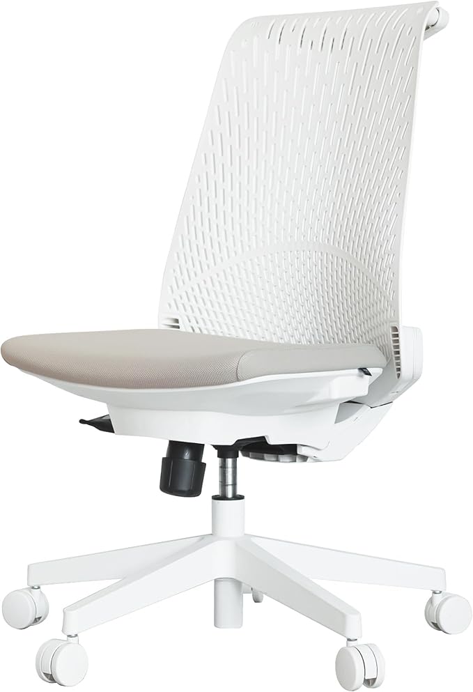 すっきりとしたデザインと、パーツを極力減らすことで軽量化を実現した白いオフィスチェアです。背もたれは弓のようなラインを描いており、座ることで自然と骨盤が立ちS字ラインになるよう作られています。