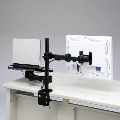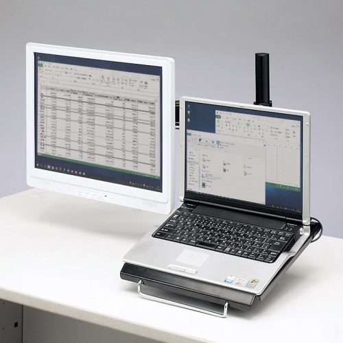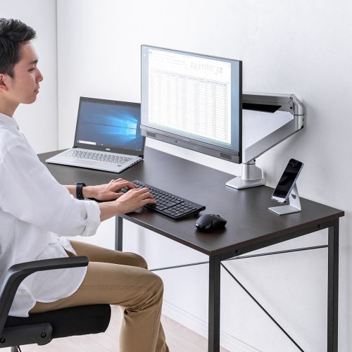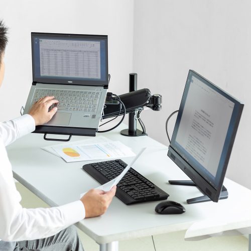 ノートパソコンを活用したデュアルモニター環境を実現するアームです。モニターとノートパソコンの2面構成により作業効率を向上させる効果が期待できるのが特徴。参照資料の表示と作業の同時進行が可能です。