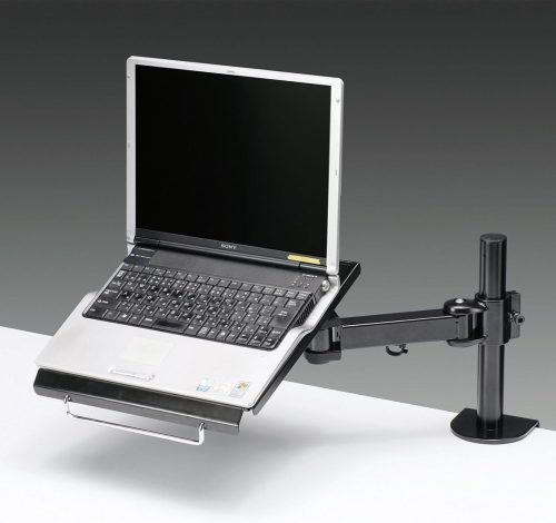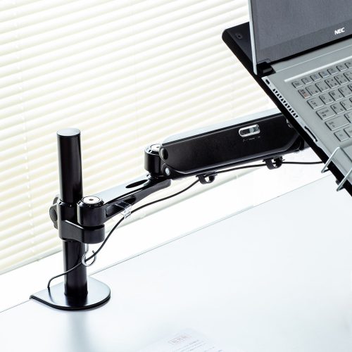 ノートパソコン用モニターアームには、チルト・パン・スウィング機能を備えた多関節アーム設計を採用したモノなどをラインナップ。机上のスペースを有効活用でき、ノートパソコンの位置を上下左右に調整できるのが特徴です。