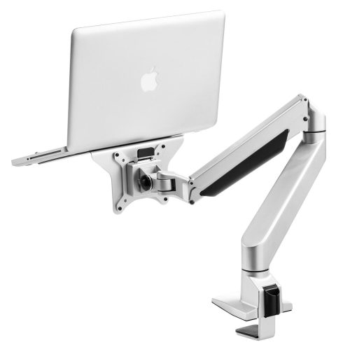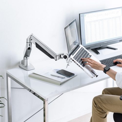 人間工学に基づいた設計を採用した、ノートパソコン用モニターアーム。作業しやすい設計ながら、デスク周りの省スペース化も実現します。17インチまでのノートパソコンに対応し、耐荷重は2~8kgです。