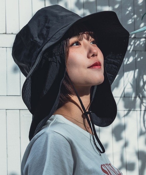 首周りをまるごと日差しから守る、ネックシェード付きサファリハットです。つばに収納できるネックシェードを展開すれば、炎天下でも首の後ろへの直射日光をしっかりカット。UPF50+のUVカット機能を生地全体に採用しています。
