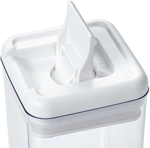ワンタッチ操作で密閉保存できるスクエア型の保存容器。フタの中央にあるボタンを押すだけで開閉でき、ポップアップしたボタンが取っ手としても機能します。ステンレス製のフタはスタイリッシュで、キッチンをおしゃれに演出します。