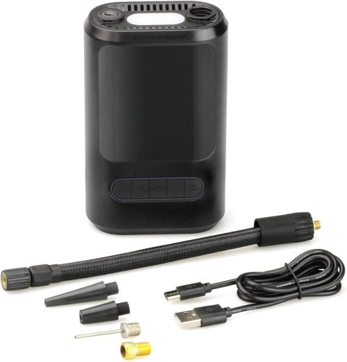 LEDライトを搭載しており、暗い場所でも効率よく作業が可能。ホースや各種アダプターを本体に収納できるため、持ち運びにも便利です。米式・英式・仏式バルブ用アダプターのほか、ボール用や浮き輪用のアダプターも標準で付属しています。