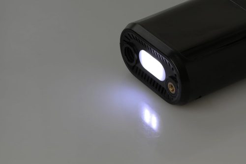最大空気圧は400KPA。外部から吸入した空気を内部で圧縮してパワフルに押し出す仕組みです。約730gの軽量ボディで持ち運びやすく、充電式のため場所を選ばず使用可能。LEDライト付きで、夜間の突然のトラブルにも対応できます。