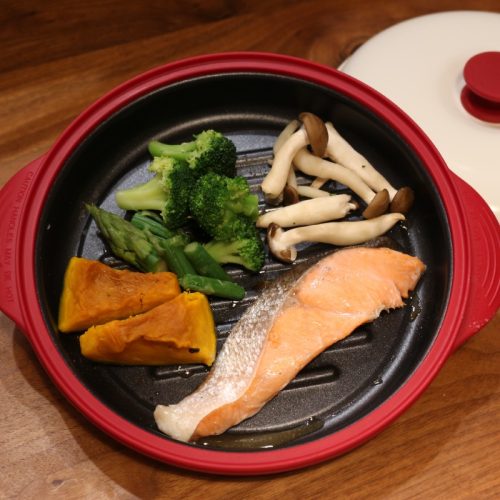 電子レンジで食材に焼き目をつけられるアイテム。耐熱陶器の発熱効果により、肉や魚を短時間でおいしく焼き上げます。調理後そのまま食卓に出せるデザインで、洗い物を減らせるのもメリットです。