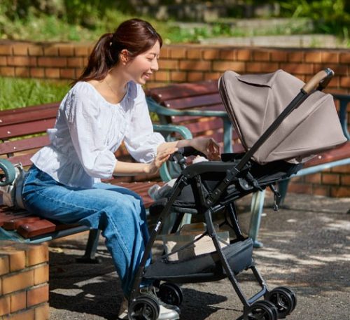 多くのAB型ベビーカーは、リクライニング機能が充実。座面をほぼフラットに倒せるため、首がすわっていない赤ちゃんも無理のない姿勢で乗せられます。