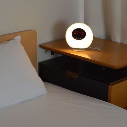 多機能な光目覚まし時計。設定したアラーム時刻の30分前から光が徐々に明るくなり、赤からオレンジ、黄色へと変化しながら部屋を照らすのが特徴です。5種類の自然音やFMラジオからアラーム音を選択できます。