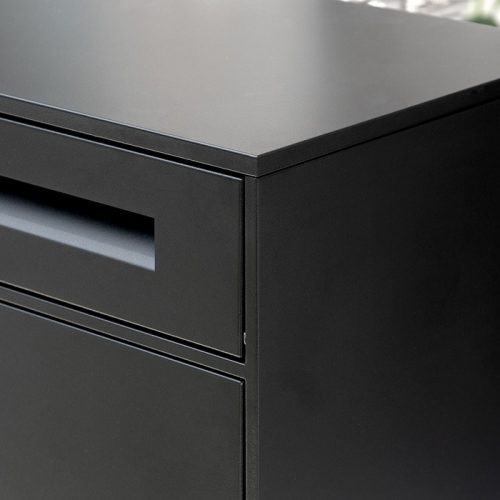 容量は135Lで、上部には手紙や書類用のメールボックスを搭載。また、付属のアンカーボルトでの固定や、ゼロリターンキーでの施錠ができます。モルタルグレーとブラックを組み合わせたモダンなデザインも魅力です。