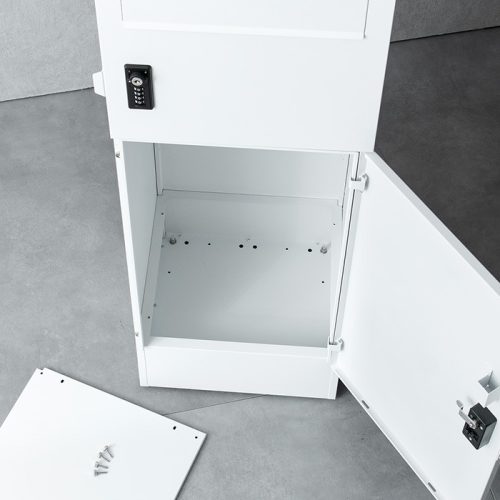 シリンダーワンプッシュ錠を採用しており、押すだけで施錠が完了。印鑑ホルダーは磁石式で取り外しができ、受け取りの際に便利です。組み立ての所要時間は約10〜20分。また、盗難・転倒防止ワイヤーが付属しています。