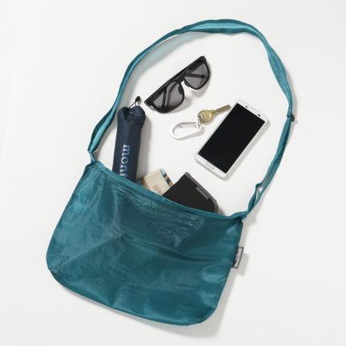 収納時は手のひらに収まるサイズになるコンパクトなショルダーバッグです。持ち運び時の負担を減らし、旅行やアウトドアでのサブバッグとして活躍します。フロントポケットは新書が入るサイズで実用的です。