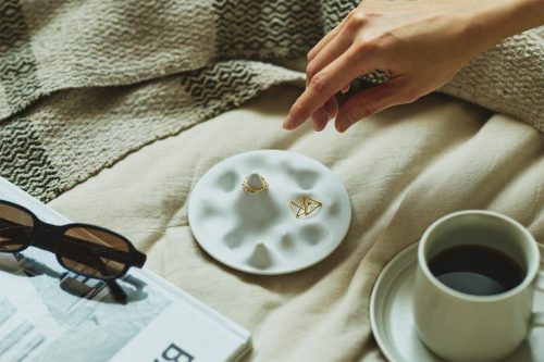 指輪部分は計算された凸部がしっかり受け止め、サイズを問わず安定して収められます。ブレスレットも散らからずに置けるため、飾るような感覚で収納可能です。