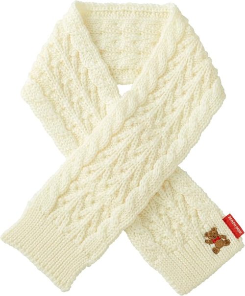 あたたかみのあるケーブル編みが特徴的なニットマフラーです。ワンポイントとしてあしらわれた刺繍ベアが、かわいらしさをプラス。アクリルと毛のブレンド素材を使用しており、丈夫でお手入れしやすいのが魅力です。