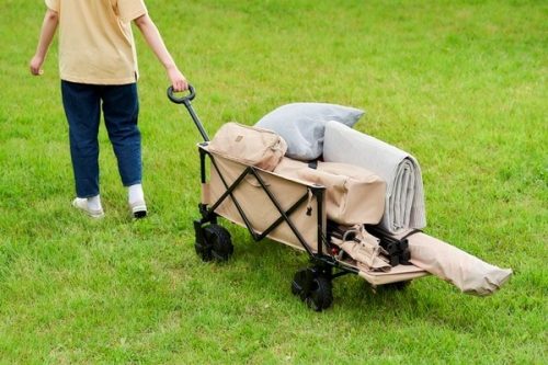 折りたたみキャリーカートは、重い荷物を一度にまとめて運べるのが魅力です。キャンプ用品や飲み物など、かさばる荷物も楽に運搬できるため、駐車場とサイトを何度も往復する必要がありません。力が少ない方でも、効率よく荷物の移動ができます。