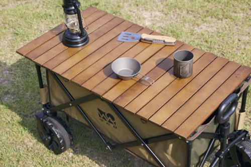 キャンプで使うなら、荷物を運んだあとにテーブルとしても使える2WAY仕様の製品が便利です。移動時はキャリーカートとして、キャンプサイトに着いたらテーブルとして活用できるため、荷物を減らしてすっきりと過ごせます。天板をテーブル単体で使える製品もあります。