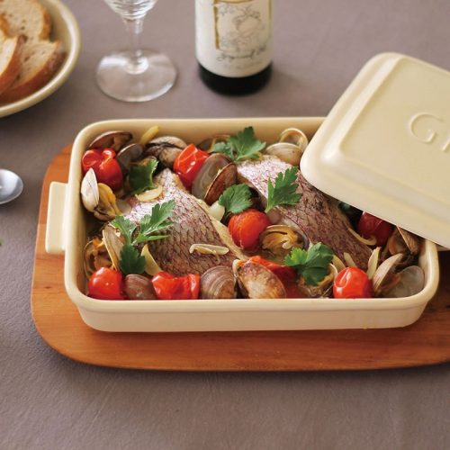 ガラス蓋が付属しているため、ふっくらとした蒸し焼き調理も可能。調理時の気になる煙を軽減できるのも魅力です。オーバル型のフォルムで魚料理や肉料理に幅広く対応。ガス火とIHの両方で使用できるため、さまざまなキッチン環境の方におすすめです。