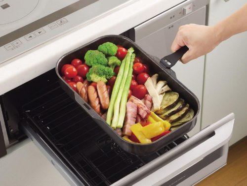魚焼きグリルを多機能調理スペースに変えるグリルパン。アルミニウム合金製で内面にフッ素樹脂加工が施されているため、焦げつきにくいのが魅力です。油を使わず食材の脂分だけで調理できるノンフライ調理に対応しています。