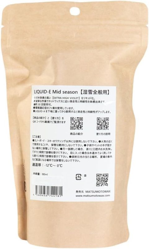 優れた持続性を備えた高フッ素配合のリキッドワックス。トップシーズンの湿雪に適した同ブランドのワックス「EXTRA HIGH VIOLET」を、手軽に塗布できるリキッドタイプにしたモデルです。シーズン始めから3月前半までのきれいな雪で性能を発揮します。