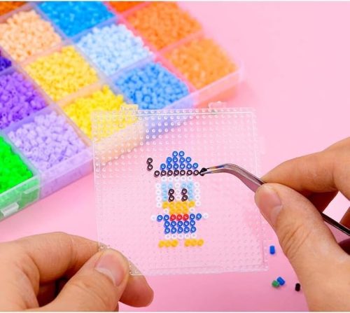 11000ピース入りと大容量のアイロンビーズセット。全30色のマルチカラーがミックスされており、さまざまな作品づくりに挑戦できるのが魅力です。専用プレートにビーズを並べてアイロンで熱すると、溶けたビーズ同士がくっついて作品が完成します。