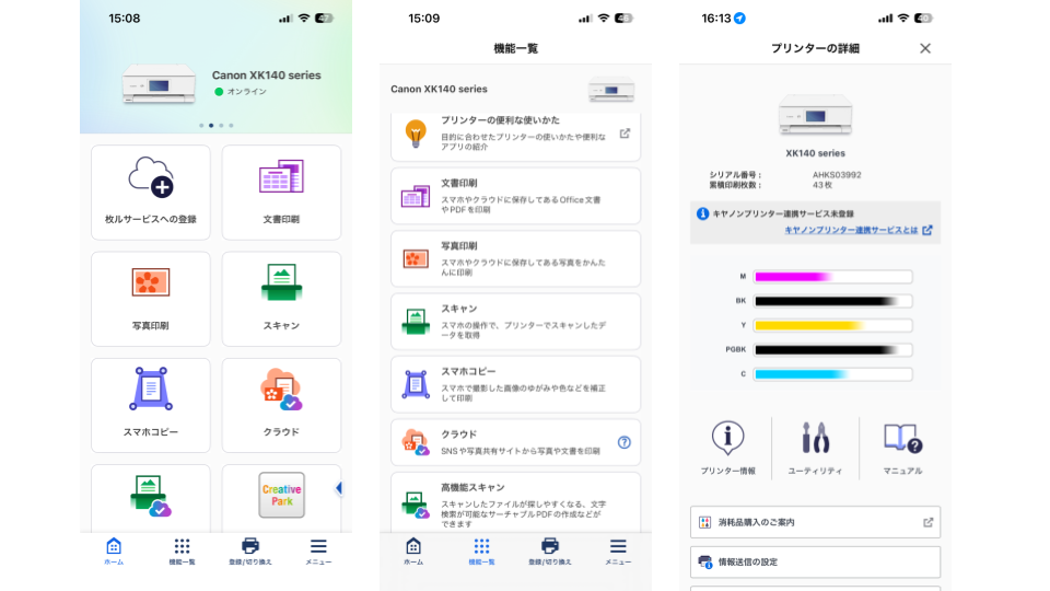 文書はもちろん、スマホやタブレット、クラウドに保存してある写真もアプリから手軽に印刷できます。プリンターの状態やインク残量もアプリ上で確認できるため、印刷途中で困る心配もありません。