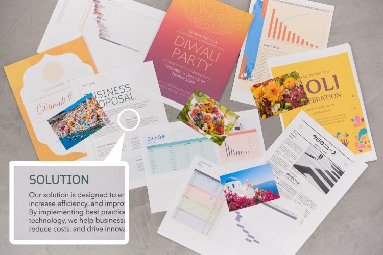 PIXUS XKシリーズの大きな特長は、キヤノン独自の印刷技術「FINE(ファイン)」による高精細な仕上がりです。超微細のインク滴を高速かつ正確に吐出し、なめらかな階調や色のつながりを再現。文書印刷では小さな文字までくっきりと読みやすく、ビジネス資料やレポートも高品質に仕上がります。