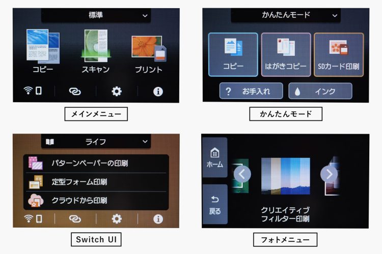 また、Switch UIには写真印刷に便利なフォトメニューが統合されており、印刷設定やレイアウトの調整が本体でもスムーズに行えます。
