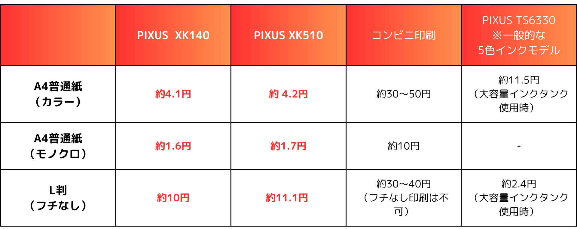 特にXK140・XK510は、1台で日常の文書印刷から写真プリント、年賀状印刷まで幅広く対応可能。A4カラー文書の印刷コストがXK140は約4.1円(税込)、XK510が約4.2円(税込)と安く、本体価格を考慮しても長い目で見ると、都度コンビニプリントを利用するよりもお得になります。