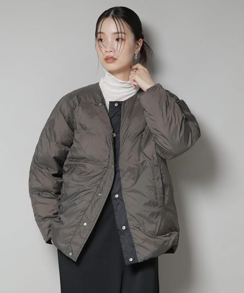 ノーカラーデザインで首元がすっきり見えする薄手のダウンジャケット。さまざまなトップスと重ね着しやすいほか、厚手のアウターの中にもすっきりと着用できます。表面に縫い目がないため、スタイリッシュな印象に仕上がっているのもポイントです。