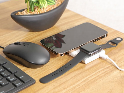 多様なデバイスを効率的に充電できる4-in-1仕様のモバイルバッテリー。1台でApple WatchやiPhoneなどに対応します。2台同時急速充電が可能で、忙しいときに便利です。
