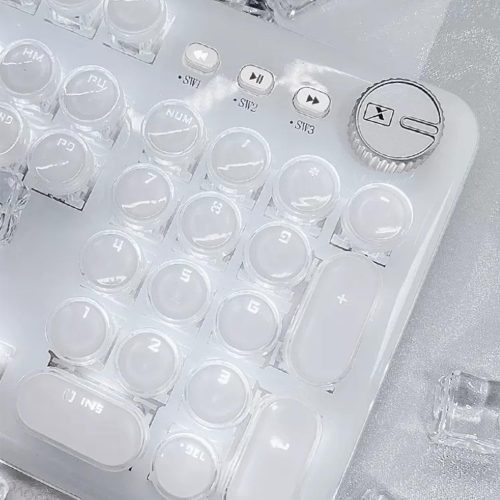 水晶のようなデザインが目を引くおしゃれなメカニカルキーボード。青軸キーを採用しており、心地よい打鍵音が楽しめます。タイプライター風のかわいい丸いキーキャップも魅力です。
