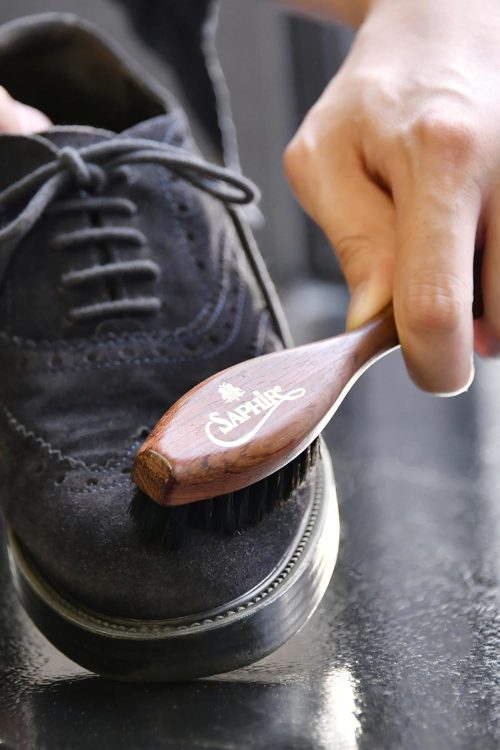 サフィールは、フランスのAVEL社が世界80か国以上で展開する革のメンテナンス用品ブランドです。天然豚毛100%のブラシは、持ち手に滑り止めの溝が付いたモノや、持ちやすい柄付きタイプがラインナップ。操作性を高める工夫が施されているのが特徴です。