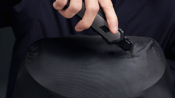 本体の外装部分には防刃素材を採用。ポリエステルとグラスファイバーを組み合わせて作られており、刃物による切り裂きに強い耐性を備えています。
