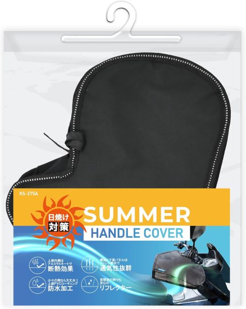 強い日差しから手を守る日焼け対策にぴったりなバイク用ハンドルカバー。上面内側にアルミラミネートを施し、断熱効果で熱を遮ると謳っています。側面と下面はメッシュ素材で、風通しがよく快適です。グリップとレバーを専用の穴に挿し込み、紐をミラーに縛り付けるだけと簡単に装着できます。