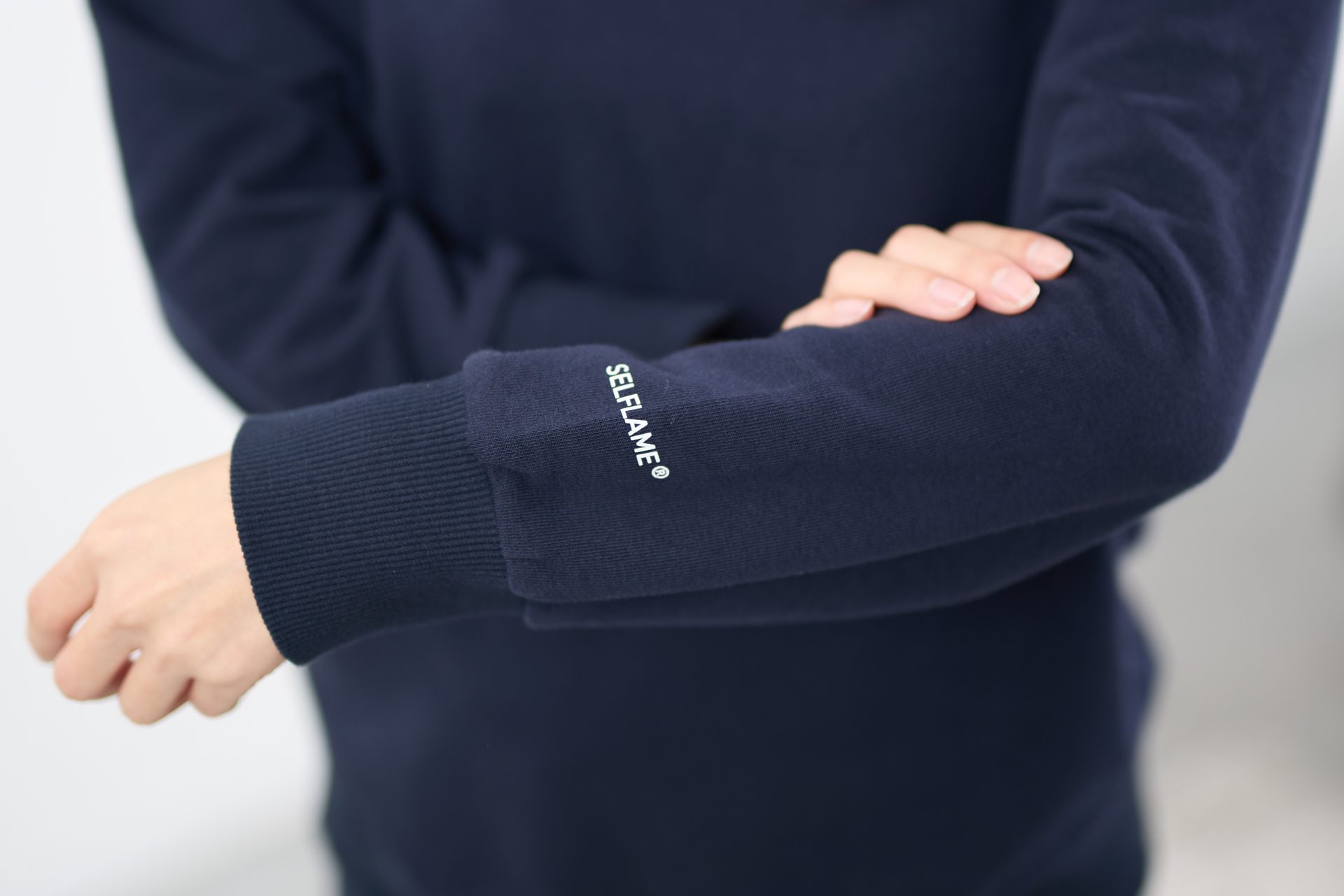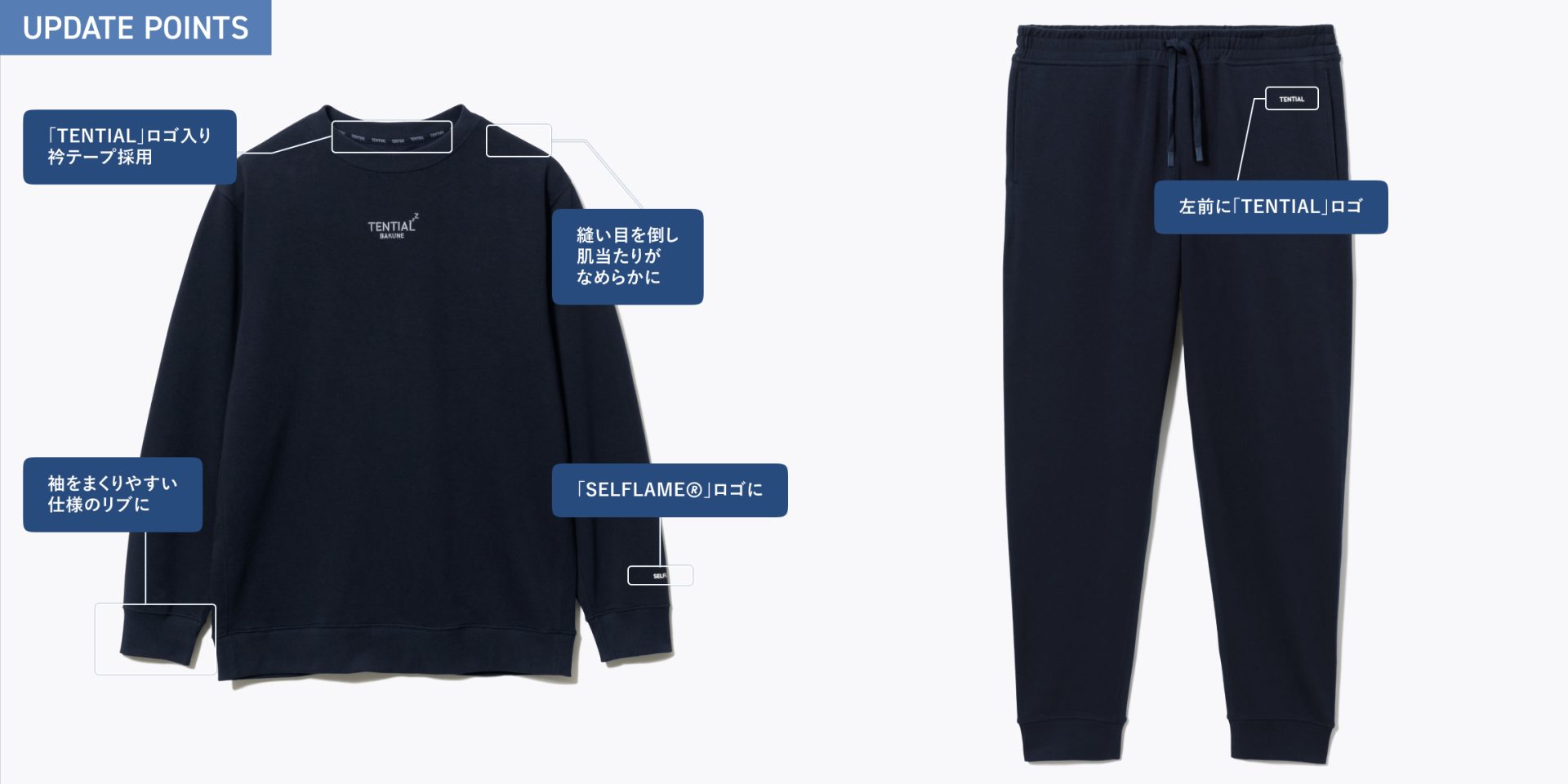 また、縫い目を倒す仕様にすることで、よりなめらかな肌当たりを実現しています。デザイン面では、襟に「TENTIAL」ロゴテープが追加され、袖のロゴが「SELFLAME®︎」に変更。さらに、ボトムスのロゴデザインも微調整されています。