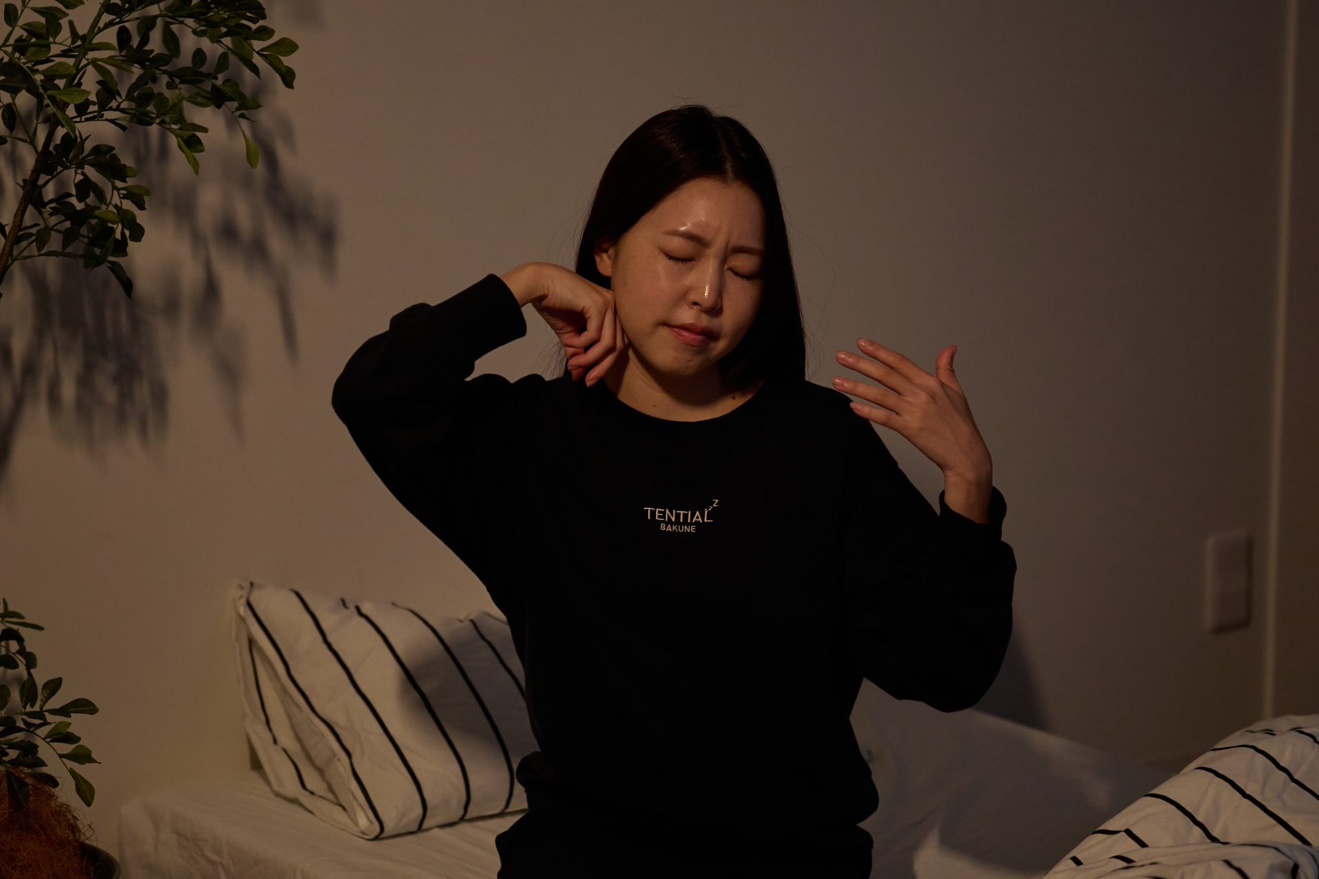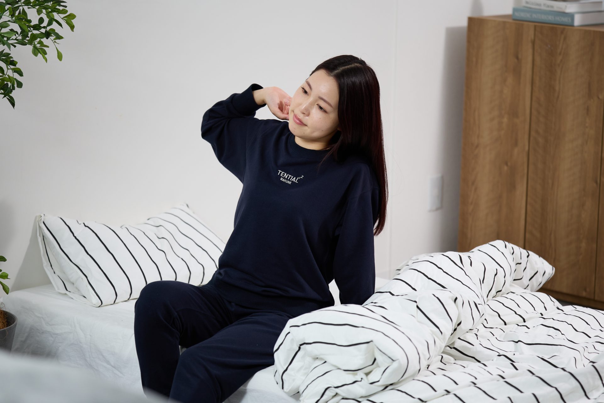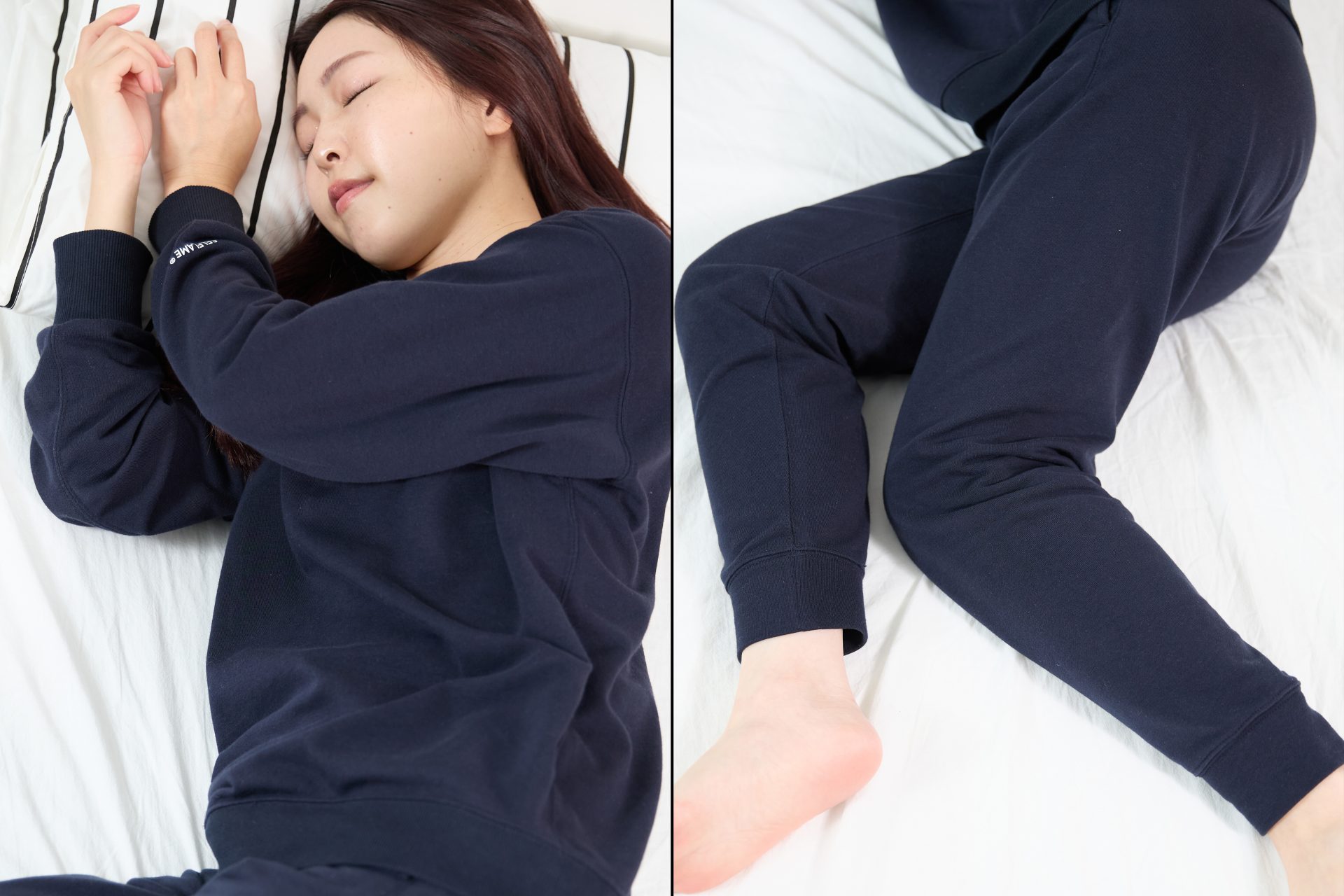 BAKUNEは、優れたストレッチ性を持つ厚すぎないスウェット生地なので、軽やかな着心地です。また、着用データを分析して誕生した「BAKUNE Motion Design」により、もたつきがなく動きやすいとも感じました。無理な力をいれず、スムーズに寝返りできるのが嬉しいポイントです。