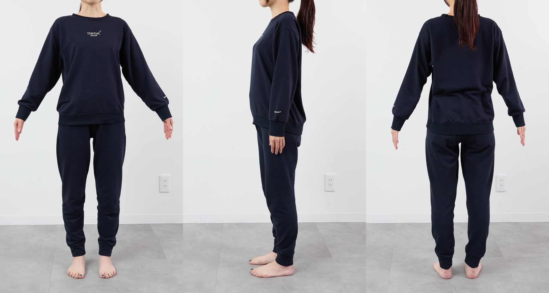 トップスの裾は、伸ばすとヒップに軽くかかる長さ。ウエスト部分は伸縮が控えめな印象で、やや着脱しにくいことがあります。ボトムスの裾口は、足首を通すときにわずかに引っ掛かりを感じました。