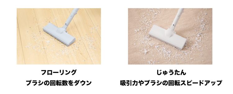 たとえば、フローリングなど抵抗の小さい床面ではブラシの回転数を落とし、細かいゴミを弾き飛ばしてしまうのを抑えながらゴミをくまなく吸引。じゅうたんなどの抵抗が大きい床面では、回転スピードも吸引力も上げ、繊維のすき間のゴミもしっかりとかき出します。
