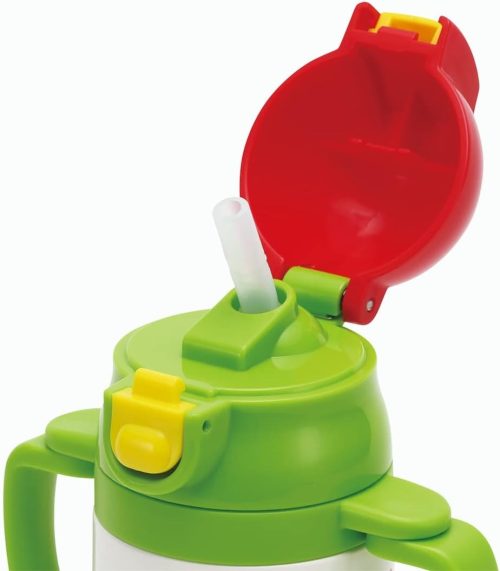 ワンプッシュで開けられるダイレクトキャップに、誤作動を防ぐロック機能を搭載。氷を入れやすいワイド口径で、お手入れは簡単に行えます。ネームプレート付きのショルダーベルトが備わっており、通園や遠足などの持ち運びに便利です。