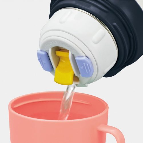 2種類の飲み口を使い分けられる水筒。直飲み時は保冷専用で容量490ml、コップ使用時は保冷・保温両用で容量450mlと、シーンに応じて切り替えられるのが魅力です。フタはワンタッチで簡単に開き、安全ロック付きなので安心して携帯できます。
