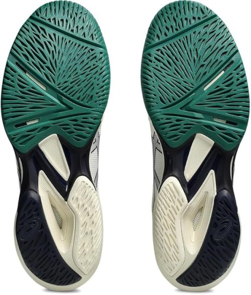 耐久性とグリップ力のバランスが特徴。アウトソールはすり減りにくく、滑りにくいパターンを持つよう作られています。特定のコートに性能が偏っていないので、幅広いプレースタイルに対応できるのがポイントです。